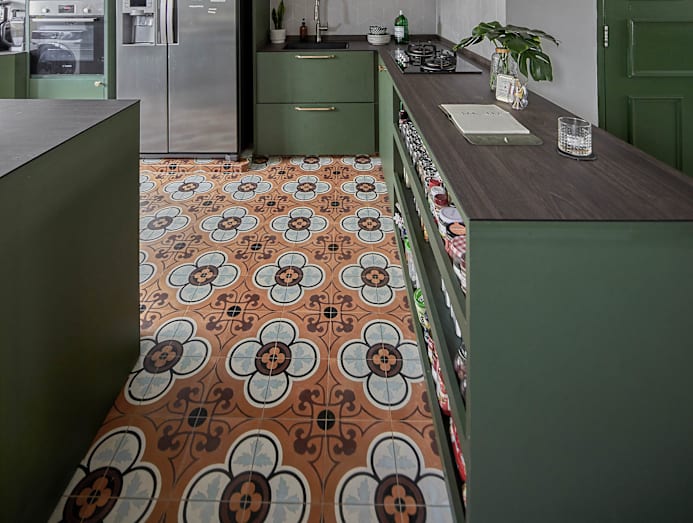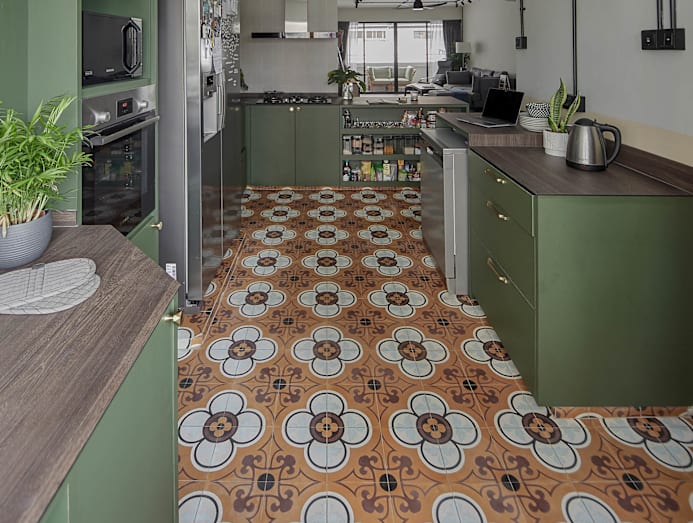 Thanks to the layout changes, the kitchen is now a charming, cheery space flooded with natural light, jazzed up with bold, vintage-esque Peranakan floor tiles, accented by forest green and mustard tones of the kitchen cabinetry. Eric also points out that the fridge is purposefully placed in the centre of the kitchen with the sink next to it.
