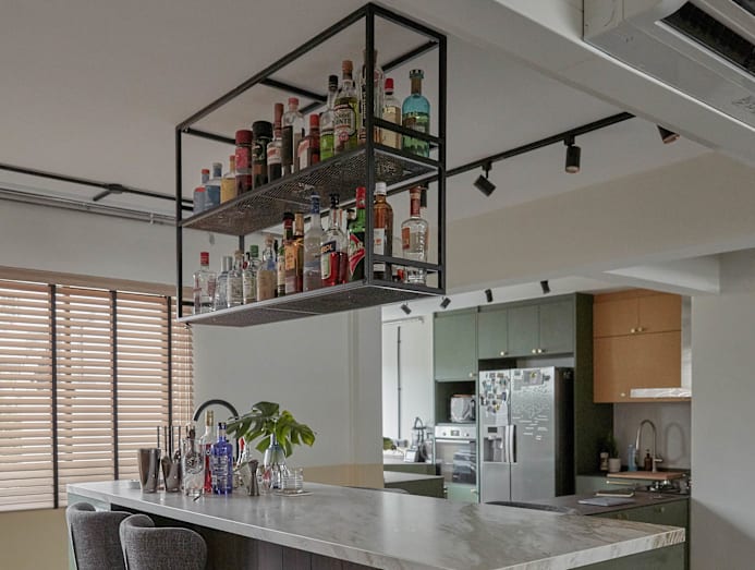 The see-through hanging cabinet above the bar counter not only serves the functional purpose of housing their bottles of booze, but also firmly anchors the bar area as the centrepiece of their home.