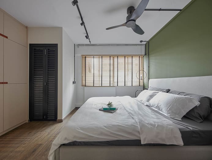 The look of the master bedroom is decidedly more muted. That said, the colour of choice for the master bedroom was once again green, albeit a lighter shade than the kitchen’s green cabinets. It’s coupled with wood tones in the blinds as well as the modern barn door, lending to a tranquil vibe in the space.