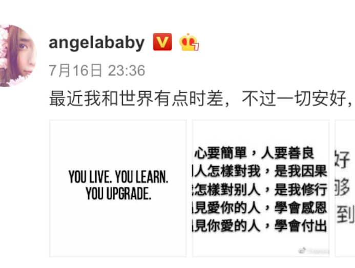 To make matters worse, Angelababy had updated her Weibo page with a rather emo post late at night on July 16. She had uploaded three images of inspirational quotes that seem to subtly imply some that there's some turbulence in her life. Either that, or she suddenly felt like treating her 100 million followers with some Chicken Soup for the Soul.