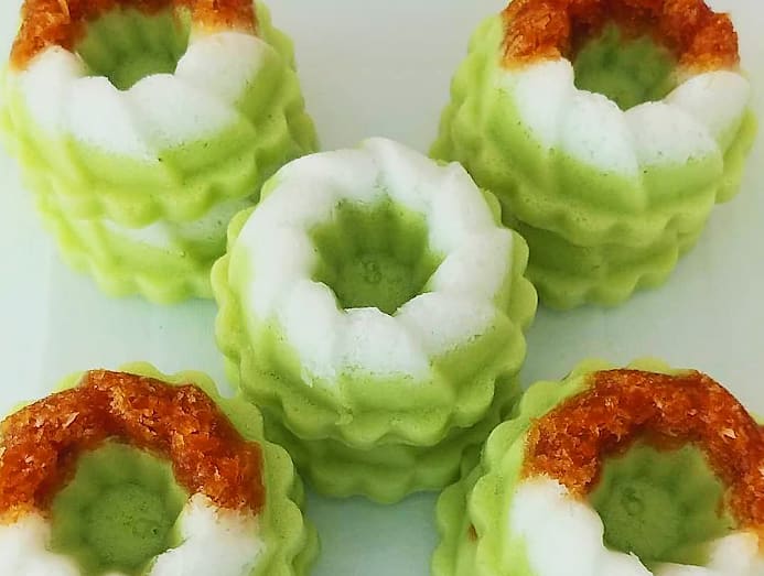 There’s so much to love about kueh puteri ayu, those mini bundt-shaped morsels of steamed pandan cake topped with grated coconut. Well, except for the effort of pressing grated coconut into multiple little moulds and filling them with batter individually. And then painstakingly unmoulding them one by one. “There must be an easier way to make this lovely confection”, we thought. Which is how we found ourselves pottering in the kitchen and filling our large bundt pan with the jade-hued batter.