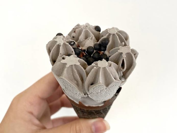 On first lick, we detect roasted earthy notes of hōjicha tea. This is quickly followed by the milkiness of the ice cream which, thankfully, isn’t overly sweet. The choc cereal balls add a welcome crunch. Better yet, there's gooey dark chocolate sauce snuggled in the middle of the ice cream, a rich, lovely surprise which pairs well with the slight smokiness of the ice cream. Meanwhile, the cone, coated with chocolate on the inside, is light and crunchy.