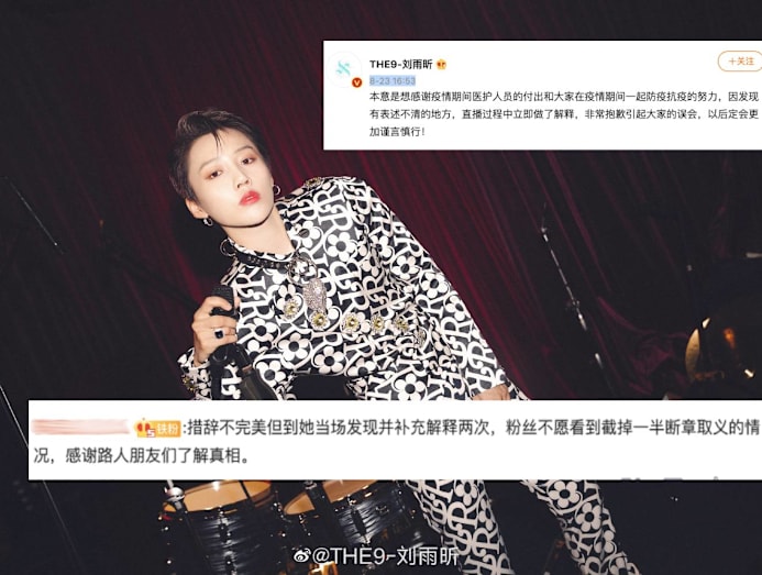 In a Weibo post on August 23, she wrote: “[My] original intention was to thank all the medical staff for their sacrifices during this pandemic, as well as [to praise] everyone for working hard to fight against the pandemic together. As there were some areas where I did not manage to express myself clearly, I immediately made a clarification during the live broadcast. I’m extremely sorry to have caused a misunderstanding, and I will make sure to be more cautious in both my speech and actions in the future!”