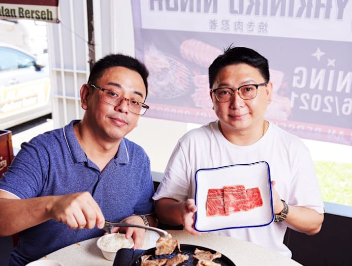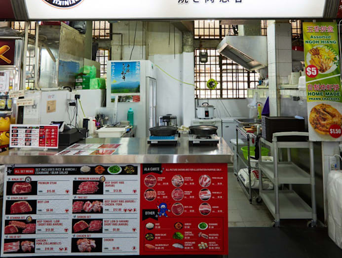 He reveals that it cost him and his partners “about $100,000” to set up Yakiniku Ninja. He’s now based at the stall with a staff member, Chuah Kean Boon (left in pic), 43, who handles the food preparation.