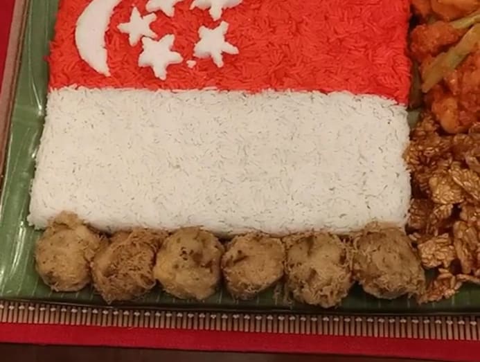 Juliana decided to surprise Vera with a Singapore flag tumpeng on her birthday on August 25 as it was very close to the National Day Parade this year. To create this, she tinted the rice with red food colouring. The rectangular tumpeng was made using a mould, while the stars and crescent were shaped by hand.