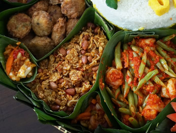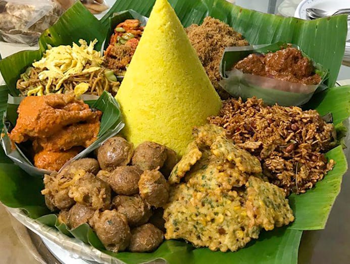 Originating from Central Java, nasi tumpeng is often eaten during celebrations and parties in Indonesia. It is typically served with nasi kuning (yellow turmeric rice) as the colour represents gold and abundance, on a banana leaf-lined bamboo platter with an assortment of dishes such as beef rendang, egg, and gado gado.