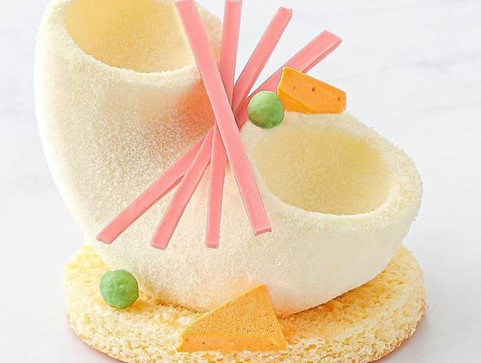 Inspired by macaroni soup in cha chaan tengs, this elbow-shaped pasta is actually lemon cheesecake made using French white cheese and Italian ricotta cheese. The macaroni cheesecake is set atop an almond biscuit, with white chocolate “ham” and marshmallow “carrots” and crispy “peas”.