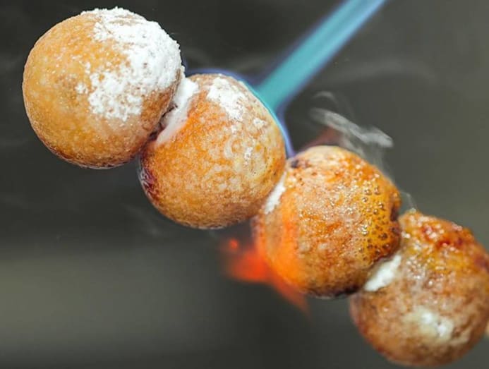 Instead of the savoury and briny street food fave version, these “fish balls” are made with fried glutinous flour balls filled with red bean ice cream mochi. Each made-to-order skewer comes with four of these sweet orbs.