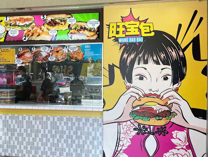 A new hipster burger stall has popped up in a kopitiam in Bedok North. Called Wang Bao Bao, the week-old stall is hard to miss with its striking neon signboard and playful pop art-inspired mural. The dishes feature Asian flavours, with the spotlight on bak kwa. Honey-infused bak kwa from local online brand 1913 Gu Lang Yu, which specialises in barbecued meat with a housemade honey and spice marinade, is used here. We find the tender, smoky slices less greasy and sugary compared to other brands of honey-glazed bak kwa in the market.