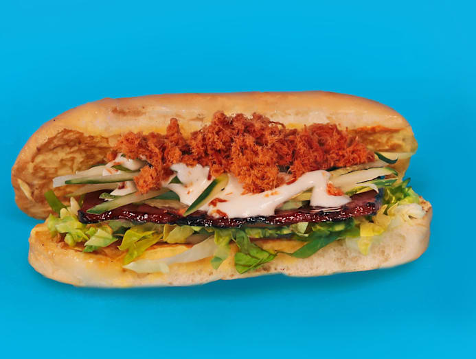 This hearty burger is for pork lovers. There’s char-grilled Spanish pork belly char siew, streaky honey bacon bak kwa, and pork floss, all perched atop a bed of carrot and cucumber pickles, and finished with an onsen egg for added decadence. Wang Bao Bao makes the char siew from scratch. Pork belly is marinated overnight with ginger, hoisin sauce, brown sugar and other spices before it is slow-baked in the oven for two and a half hours.