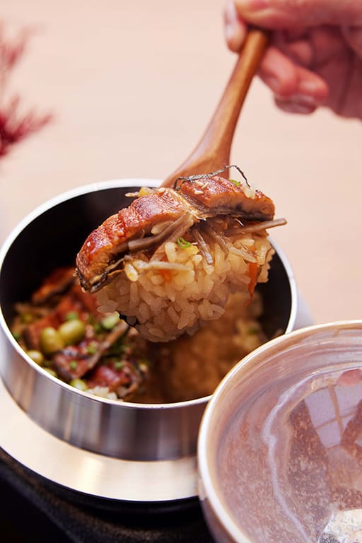 We lift the lid off our kamameshi pot to reveal slabs of grilled freshwater eel nestling on fluffy grains that have been tossed with crunchy veggies like edamame and julienned carrots. You’re encouraged to mix the rice and toppings and lift portions of it into a bowl to savour. We like the comforting appeal of the extra flavourful, steaming hot freshly-cooked rice (see, this is why waiting pays), which is dotted with crunchy grains from the bottom of the pot, and the glazed unagi with a whisper-light hint of crispiness.