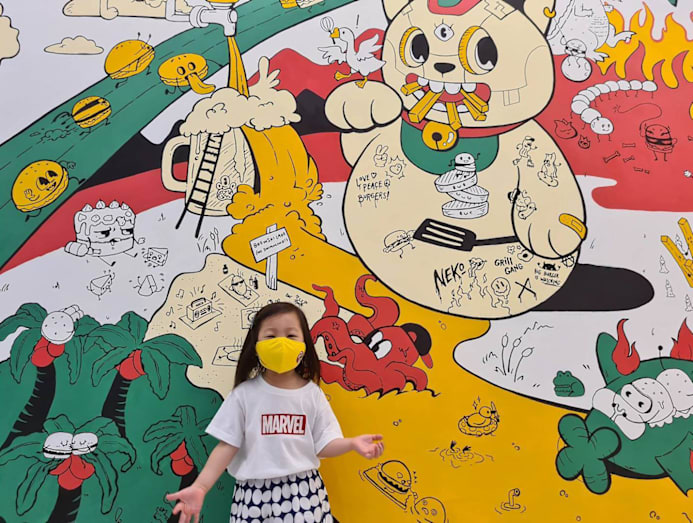 Great for the 'gram is this funky mural. The couple’s daughter, affectionately nicknamed ‘xiaobaobao’ (a pun on burger, which has a similar pronunciation as “baby” in Mandarin) poses in front of it.