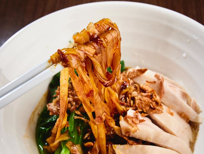 If you enjoy the heavy-handed seasoning of Malaysian noodle dishes, you’re going to like this dish. Savoury, dry-tossed hor fun is slicked with plenty of dark soy sauce and oyster sauce and heaped with fried shallots – providing enough richness for pairing with the plain poached chicken.