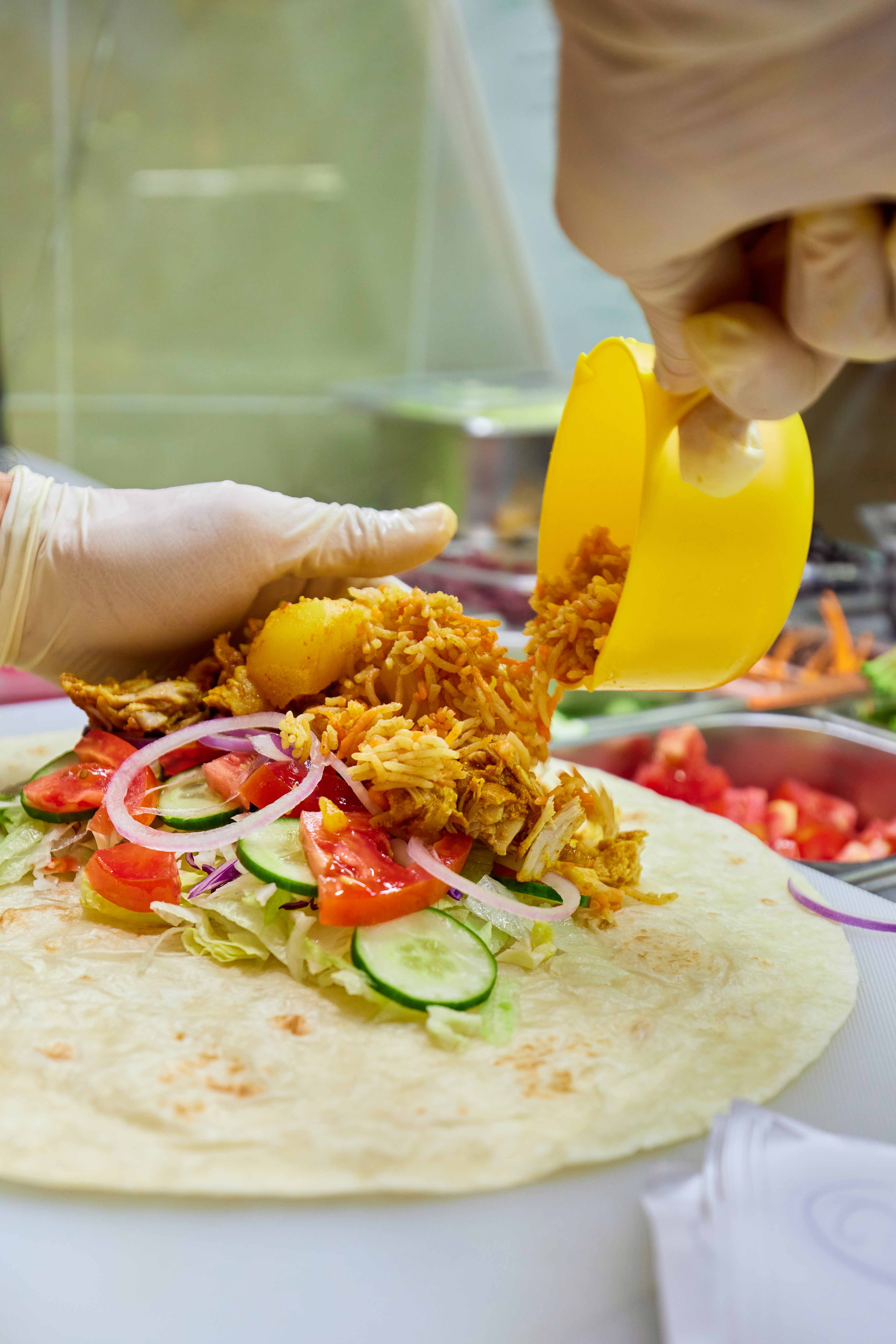 We love these giant wraps, each stuffed full of lettuce, cabbage, onion, tomato, grilled chicken or chicken biryani and three toppings (options include biryani rice, broccoli, mozzarella cheese and more) and two sauces (including their yummy curry).
