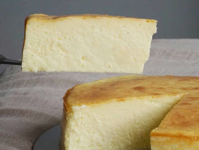 Made from a mix of cream cheese, sour cream, heavy cream, yogurt and white chocolate, it’s lightly burnished surface contrasts with its pale interior flecked with specks of vanilla beans.