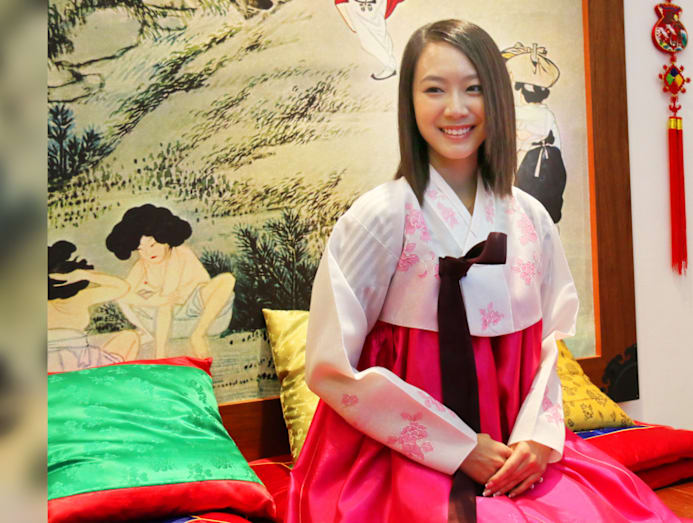 Annyeonghaseyo! Doesn’t Julie look gorgeous in a hanbok? Our only gripe is with that striped top she’s wearing inside. Now we can’t unsee it.