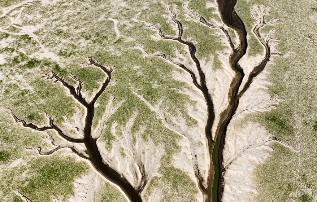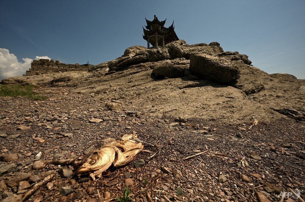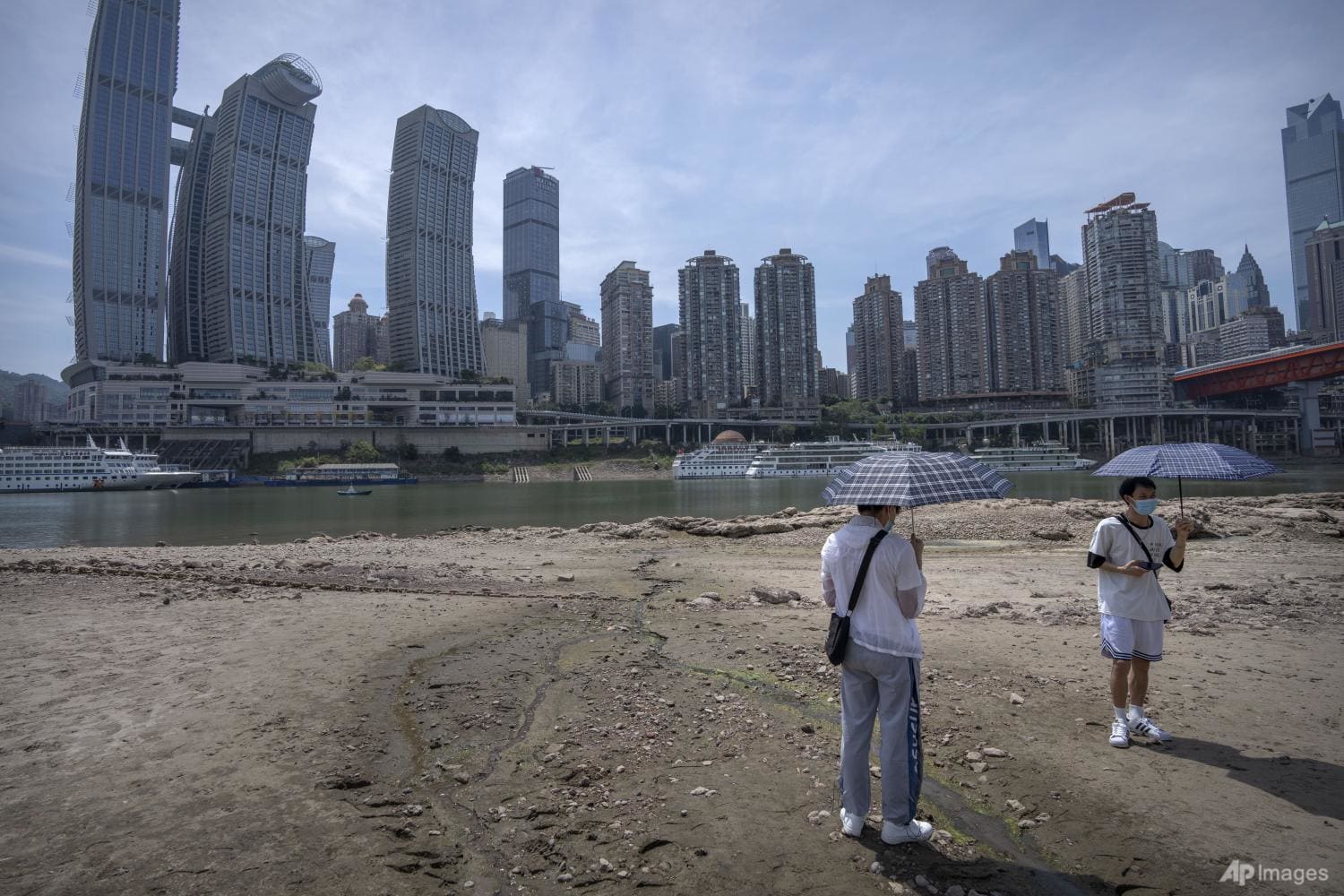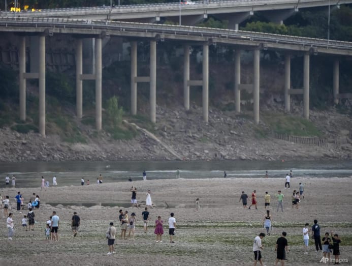 People sit in a shallow pool of water in the bed of the Jialing River, a tributary of the Yangtze, in south-western China's Chongqing municipality on Aug 20, 2022. (Photo: AP/Mark Schiefelbein)