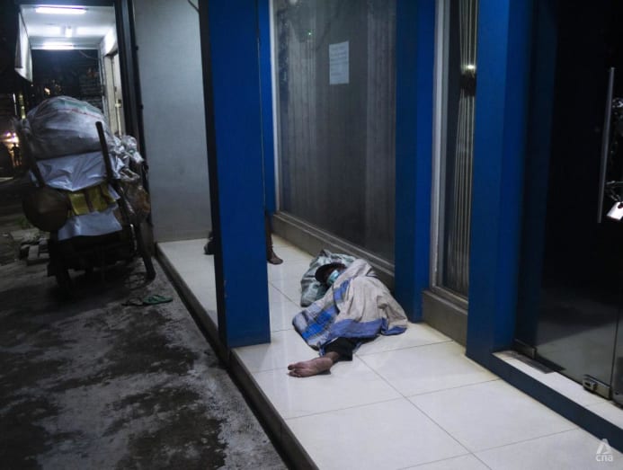 A homeless man sleeps in front of a closed department store in a commercial district in Jakarta, Indonesia. (Photo: CNA/Nivell Rayda)