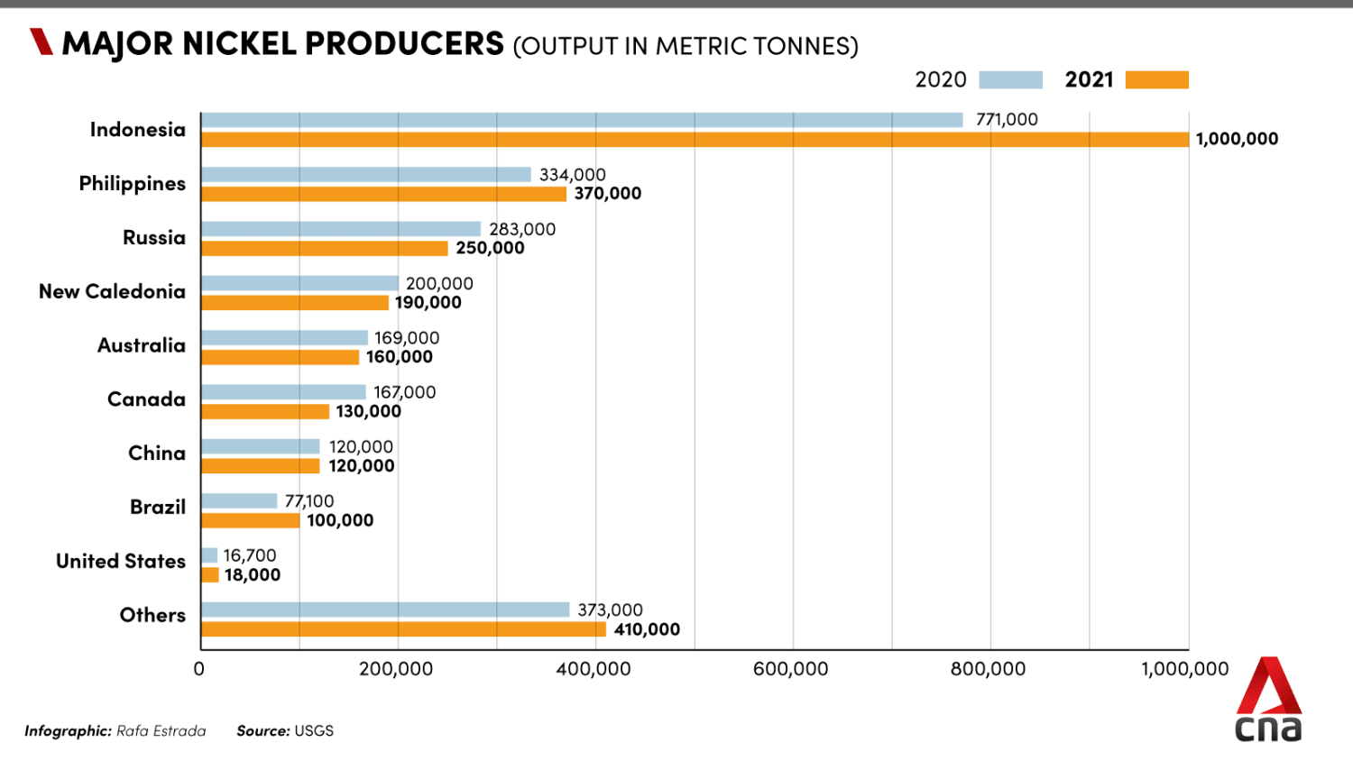In 2021, Indonesia was the biggest nickel producer in the world, producing one million metric tons of nickel, according to the United States Geological Survey, an agency which provides information on natural resource conditions.