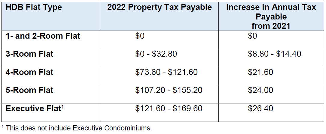 The 2022 property tax payable for HDB flat owner-occupiers is as follows: