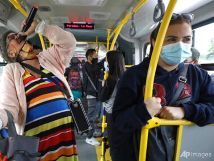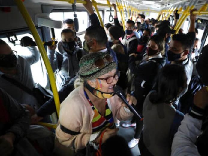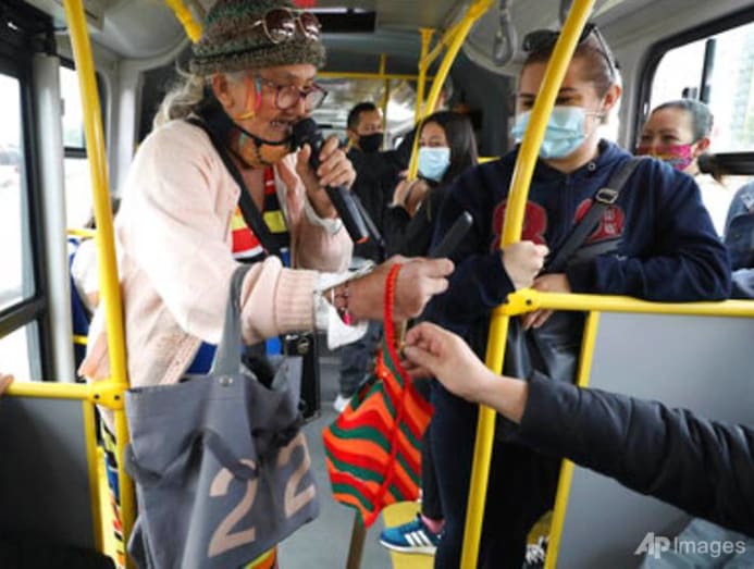 Marlene Alfonso, a 69-year-old Venezuelan grandmother who goes by “Toothless Cindy,” sings about Venezuelan migrants' lives in hopes of tips from commuters on the Transmilenio, the crowded and crime-ridden public bus system in Bogota, Colombia, Tuesday, Nov. 3, 2020. (AP Photo/Fernando Vergara)