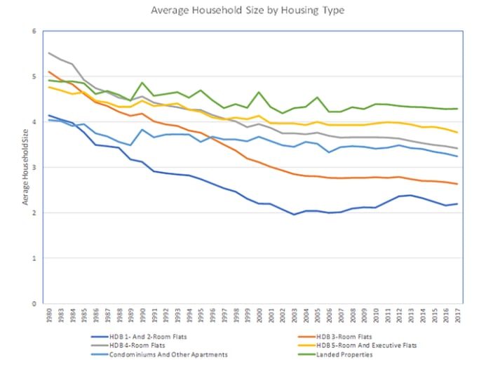 The changing demographic structure may have implications for the demand for HDB flats, but the causal effects are not as clear. Did HDB and private developers respond to dwindling trends in household size by building smaller flats and private apartments? Or did household sizes shrink because developers built smaller apartments?