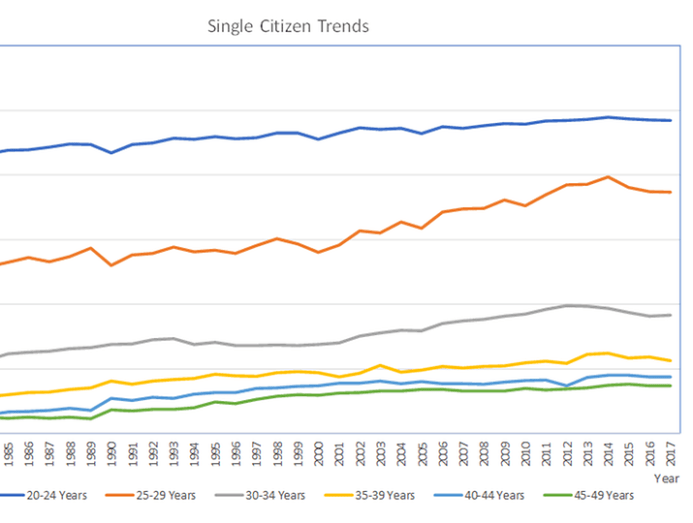 Compared to their parents’ generation, a huge proportion of those in their thirties are staying single. More than 2 in 10 in their late-thirties are single – a group that will probably live on their own and will need housing that caters to this independent lifestyle.