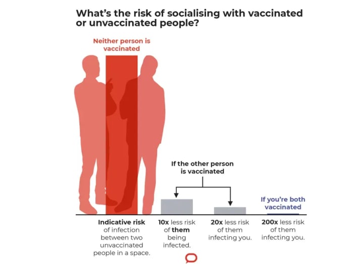 The exact number depends on a range of factors, including the type of vaccine and time since vaccination. But in Australia, we can expect a large risk reduction when mixing with fully vaccinated people.