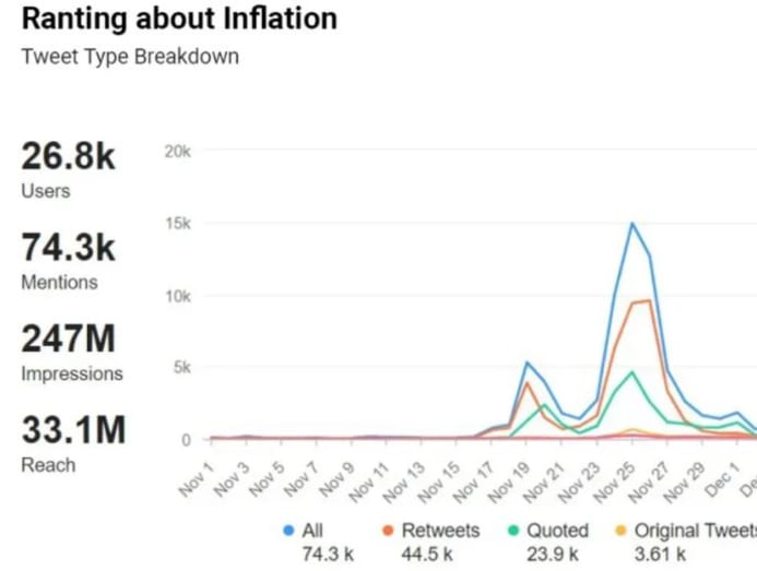 There was a spike in the number of mentions about inflation from Nov 23 to 27, 2021. This was partly due to government and news reports about the exponential rise in prices of daily necessities.