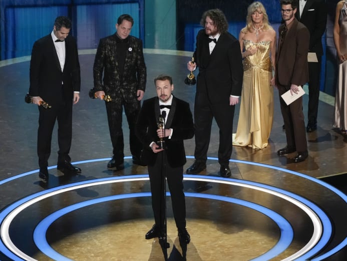 The cast and crew of Anora accept the award for best picture during the Oscars on Mar 2, 2025, at the Dolby Theatre in Los Angeles. (AP Photo/Chris Pizzello)