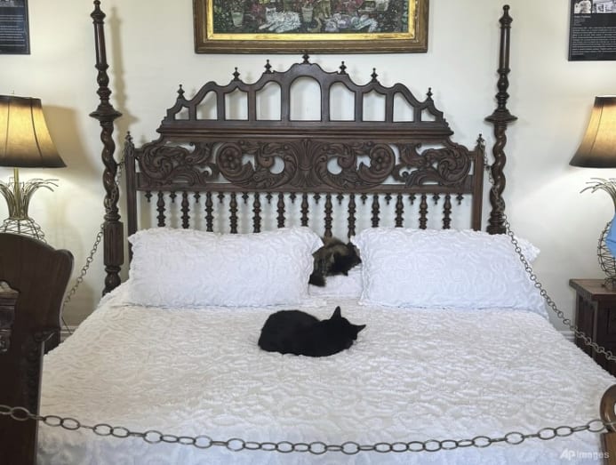 Visitors are kept away from the original furniture, but the animals lounge on the writer’s desk. A large “Cat Bible” helps track the lineage of the resident felines.