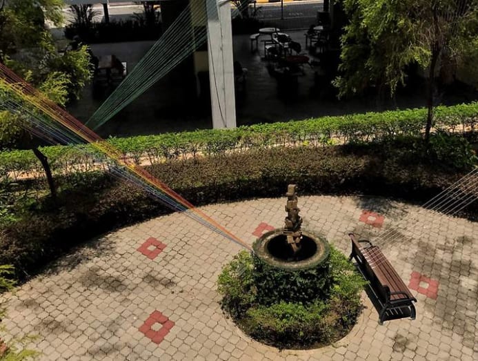 For example, in 2017, I created an installation in a garden in my junior college using metres of self-dyed twine to bring “light” to the space. The work spanned from the fifth to first floor, with strings connecting different points in the garden to the railings on upper floors. A lot of running up and down the stairs was necessary to set it up but I enjoyed myself nonetheless and the effort was more than worthwhile.