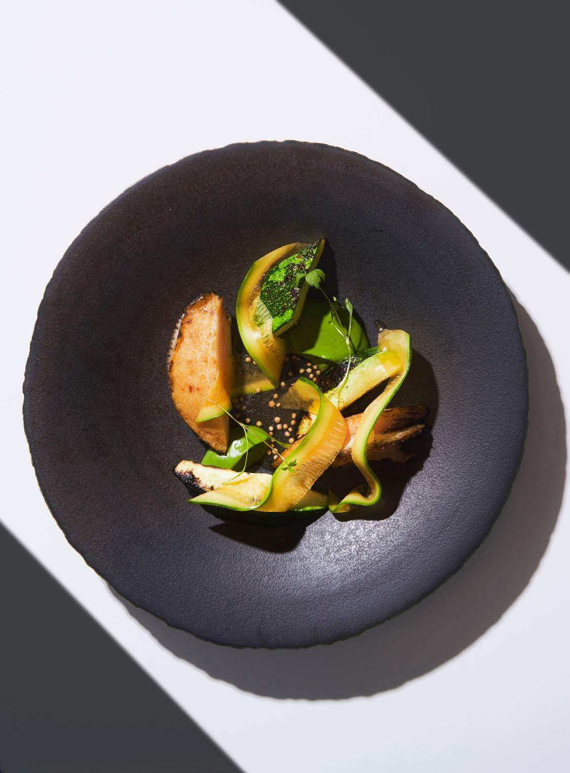 Another wood-fired dish at Bornyon is Abalone, Summer Squash, Golden Plum, which has steamed abalone coated with beef tallow and grilled over charcoal. “It is accompanied by a puree made from slow-roasted zucchini, cooked in a wood-fired oven to bring out a mellow sweetness. I balanced the dish with a touch of acidity from yellow plum syrup, aged since last summer,” chef Bae said.