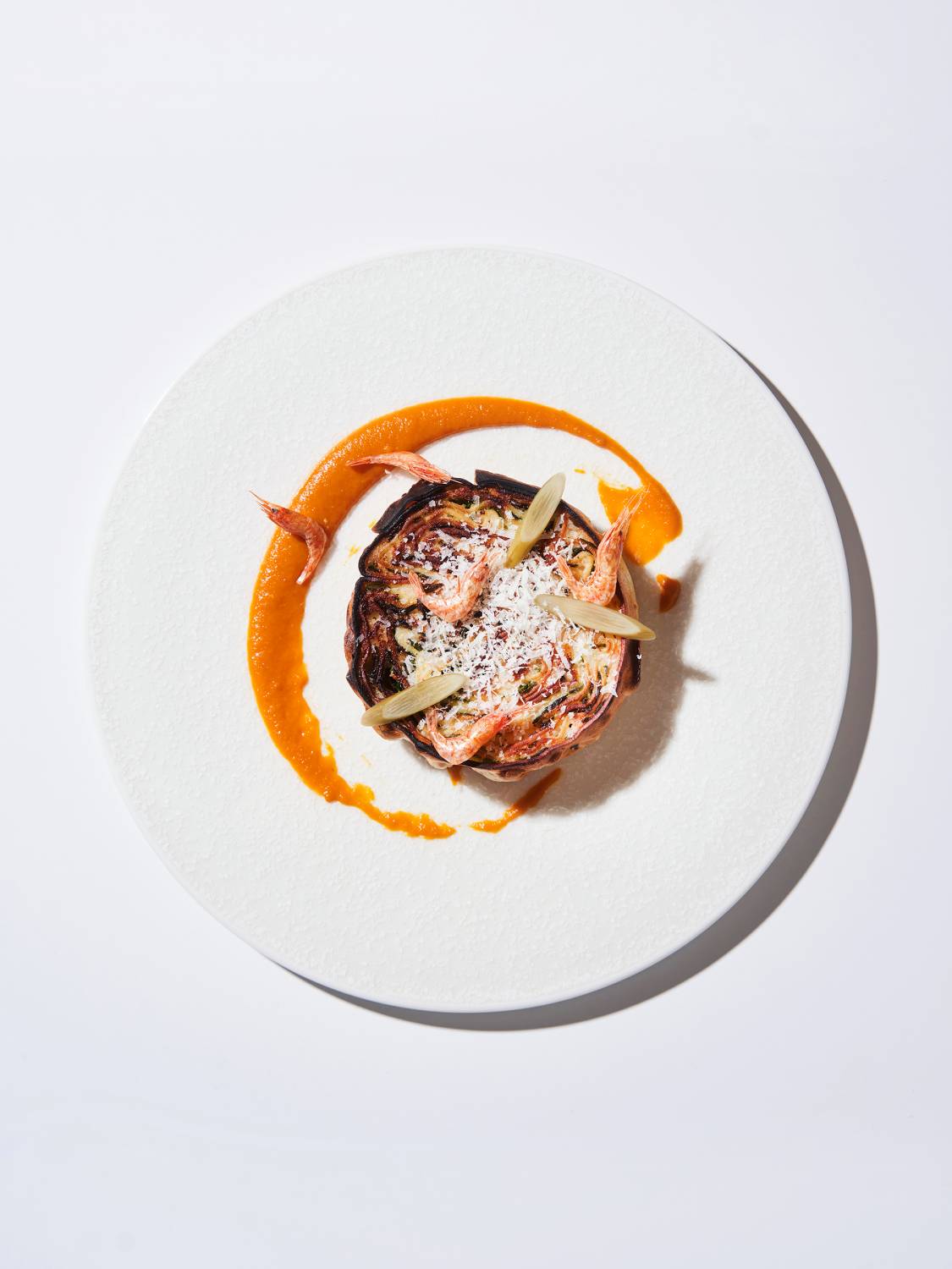 “I’ve always found the aroma of charred chives while cooking the pancake on rainy days or holidays to be especially appealing. Drawing on that experience, I grilled chives over charcoal and filled them with fresh shrimp. I also added extra depth to the dish by roasting dried red shrimp from Wando over a wood-fired oven to enhance their fragrance,” chef Bae elucidated.