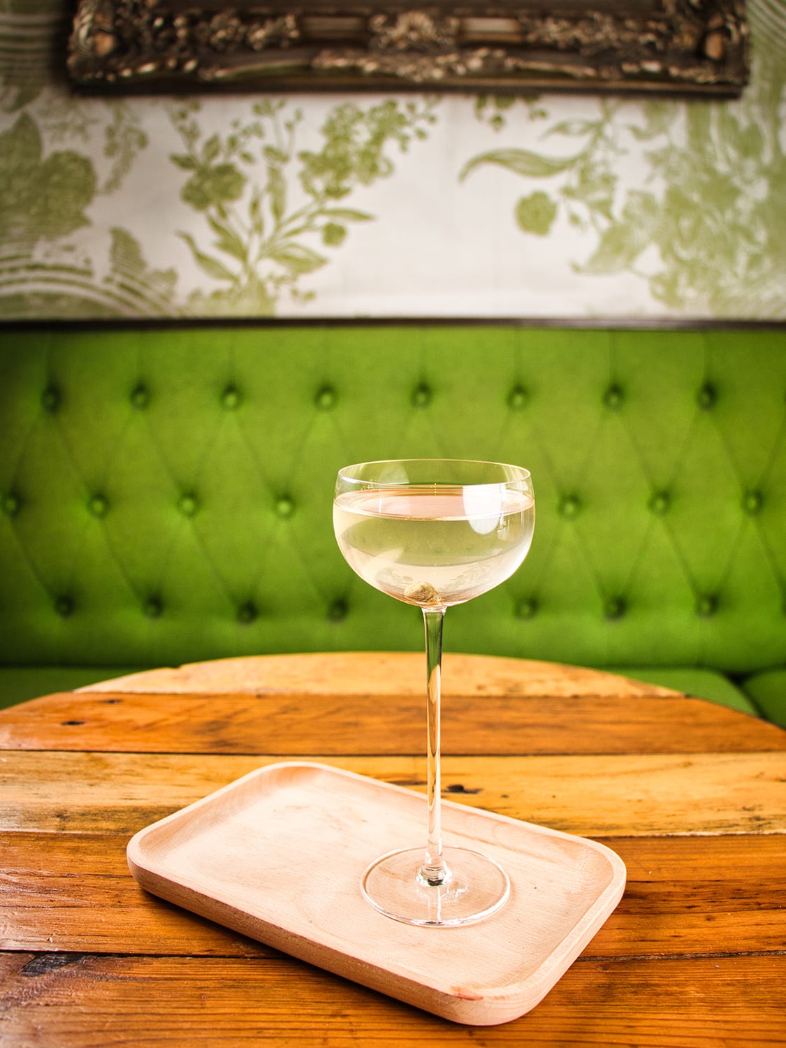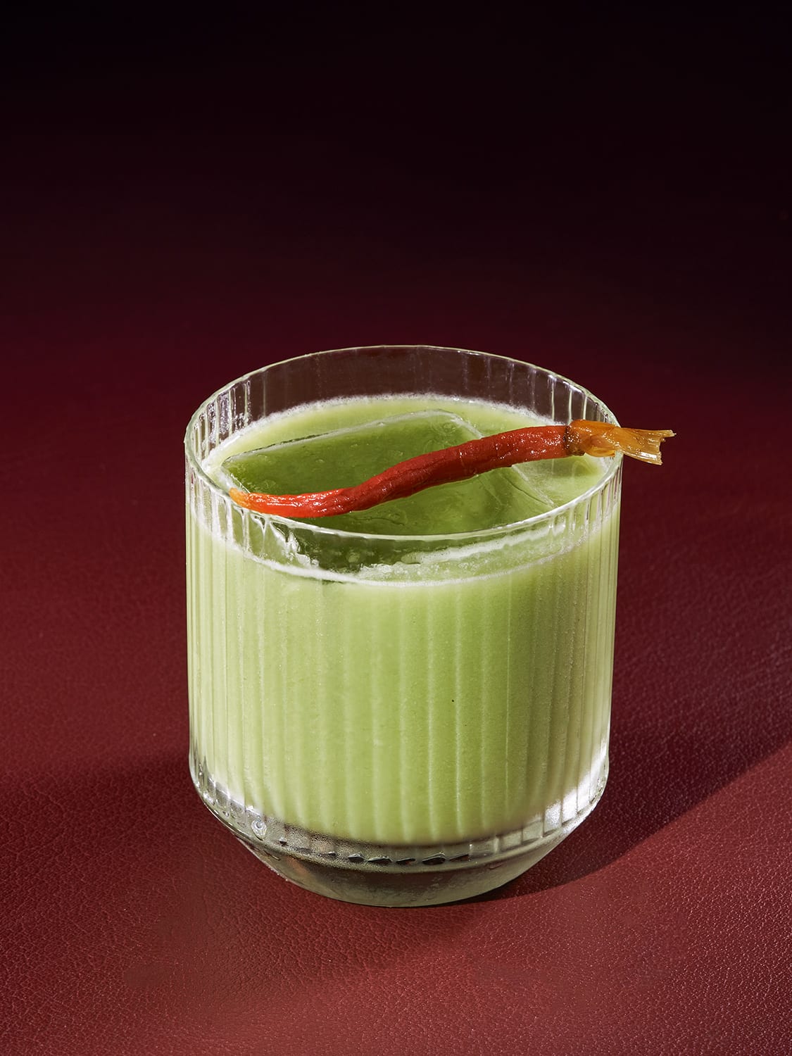 At first glance, it looks like a healthy juice. But this green Bloody Mary is anything but. The combination of wasabi distillate, green tomatoes, green peas, jalapeno, salt and pepper, delivers a deliciously heady and bright stunner. The shot of heat fades in a few seconds and the pickled carrot gives a rounded, savoury finish.