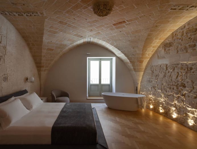 The historical centre of Lecce, in the Apulia region, is rife with Baroque buildings, including this boutique hotel in a limestone mansion that dates to 1557. After a four-year renovation, the property is now an 18-room-and-suite getaway that mixes contemporary design with vaulted ceilings and graceful arches. The rooms are elegant and spare, with 18th-century wooden doors, and each nods to the building’s past, with different touches, including stone walls, brick-and-lime floors, and walls adorned with frescoes. For a special occasion, book the more-than-1,000-sq-ft Suite Zimara, with a balcony, two bathrooms and your own hammam, Jacuzzi and fireplace.