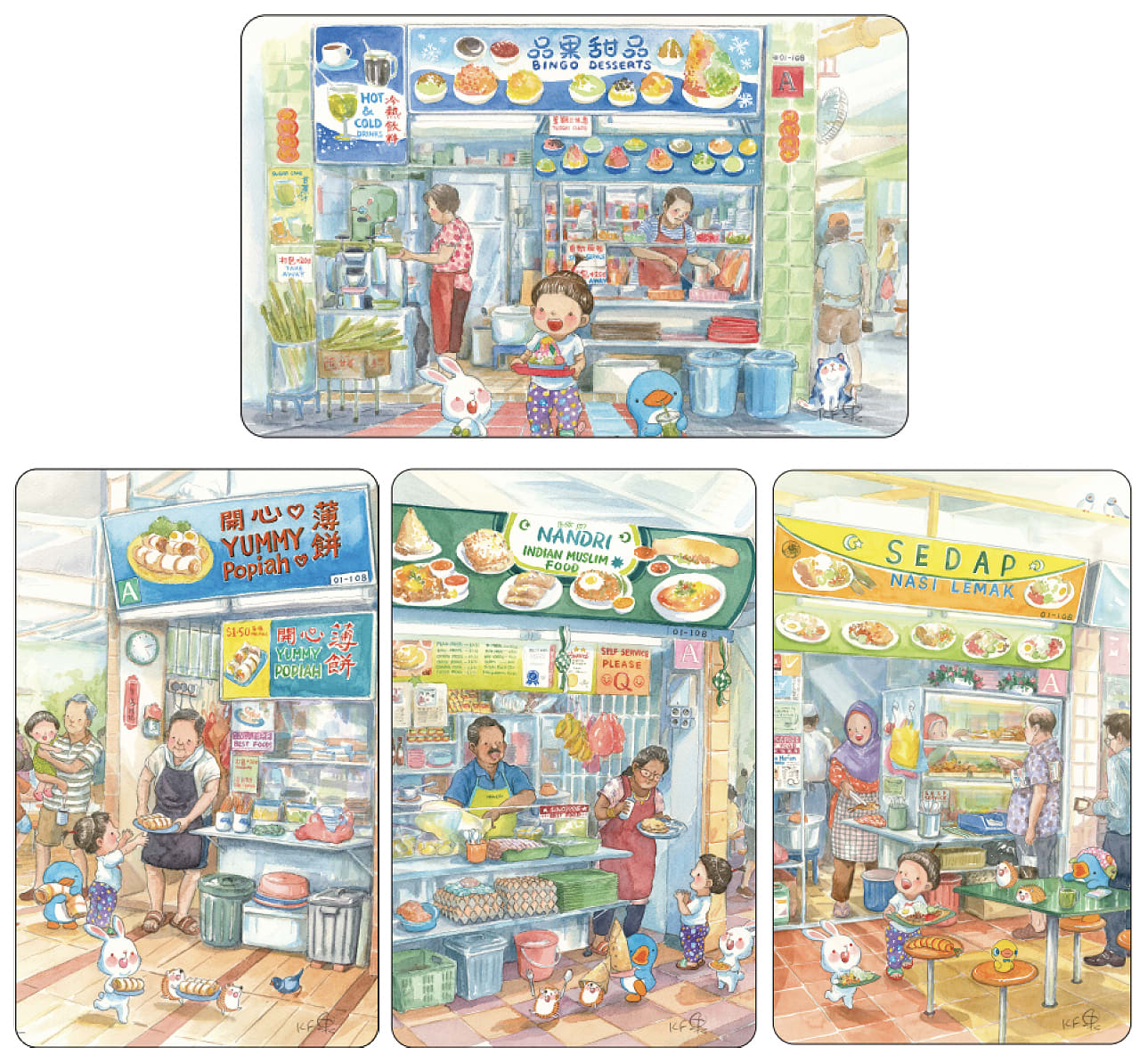 The cards with Lee’s artworks, on the other hand, will feature pieces from his Hawker series, which depict a child going to different hawker stalls to buy dishes from various cultures, including popiah, roti prata and nasi lemak.