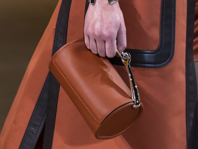Also spotted on the runway was the cylindrical shaped Maximors bag, with two metallic links forming the top handle.