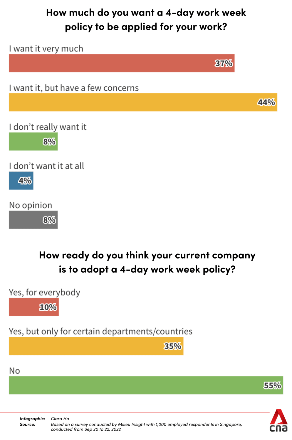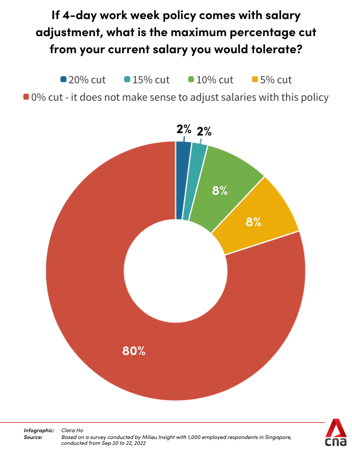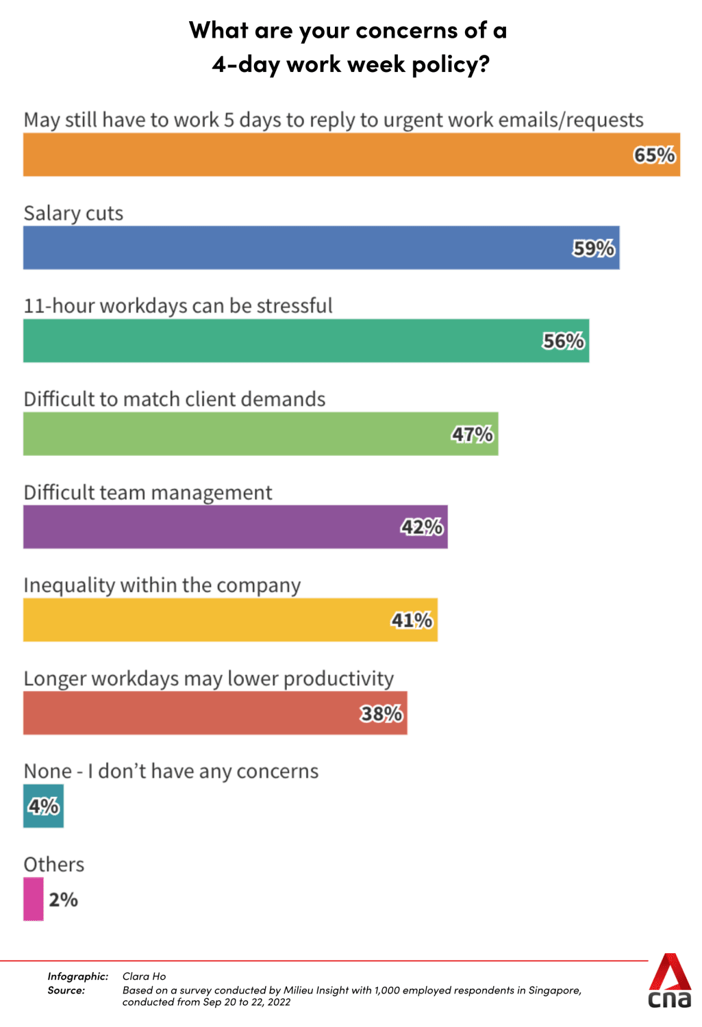 Many (59 per cent) were also worried about possible salary cuts and longer work days (56 per cent), should the work week be shorter. Among those surveyed, 80 per cent did not think that a four-day work week warrants a wage cut.
