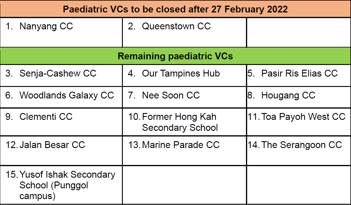 Two paediatric vaccination centres (VCs) at Nanyang Community Club (CC) and Queenstown CC will cease operations after Feb 27, said MOE.