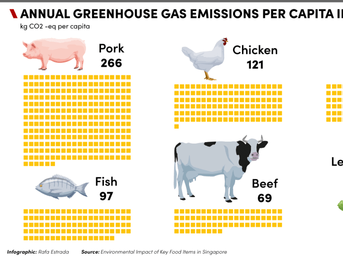 The study also said that at the time, 29 per cent of the average Singaporean’s diet consists of meats, eggs and seafood. The study noted that meat products such as pork have significantly higher greenhouse gas than fruits and vegetables.
