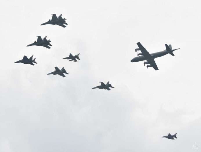 The flypast comprised three segments, with the middle portion involving 10 air assets from Singapore, Malaysia, Australia and New Zealand flying in formation.