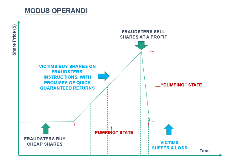 In the "dump" that follows, the fraudsters then sell their shares in the company while the share price goes up, before stopping all activities.