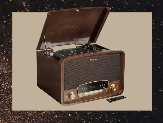 Don’t let its old school exterior fool you. High-tech music buffs will dig this Bluetooth-enabled, seven-in-one beauty that plays vinyl and CD. Its hand-crafted, acoustically tuned wood cabinet checks off the sound quality box.