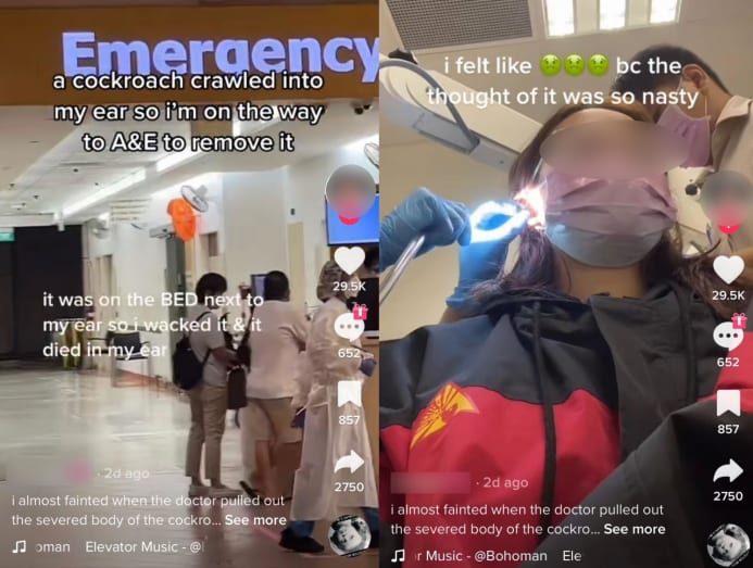 That was exactly what a young woman in Singapore did when a sizeable cockroach (about 4cm) got into her ear while she was sleeping. In the TikTok video she posted, she recounted initially feeling its legs tickling the outside of her ear and when she “whacked it really hard”, it escaped into the only opening it could find: Her ear.