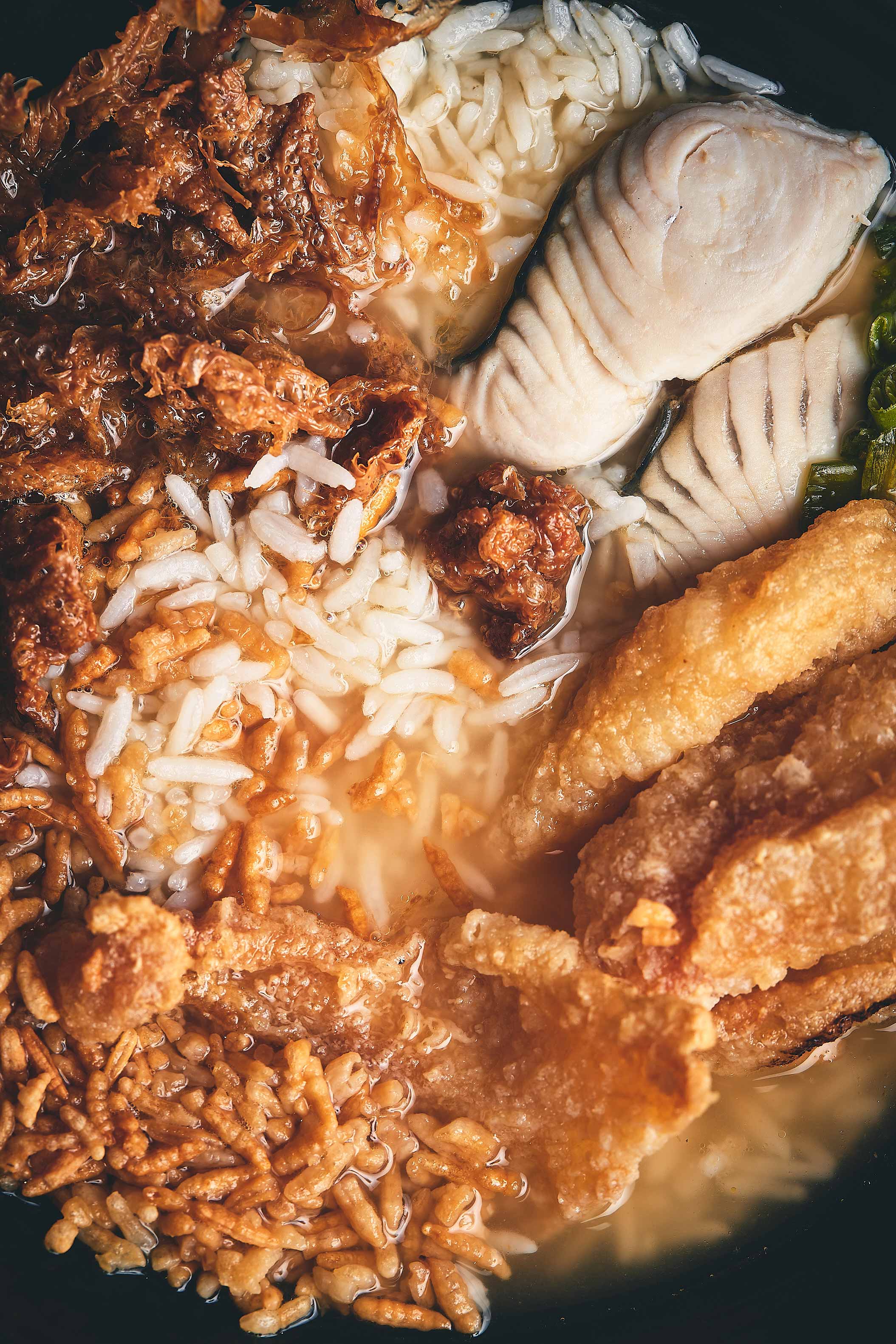 The broth is slightly cloudy, with a lovely tinge of brine from the prawn heads. We like that the medium-bodied soup is not too gao, so you can enjoy the natural flavours of the fresh batang fish slices and hearty nuggets of well-seasoned fried dory – the latter gets a quick refry upon your order to ensure they stay crispy. The tasty deep-fried puffed rice adds a crunchy contrast to the softer boiled grains, making every bite a delightful mix of textures. We also love dipping the fried fish in the house-made chilli sauce, which has a satisfying kick.