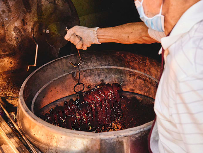 The shifu has been using charcoal to roast meats for over 50 years.
