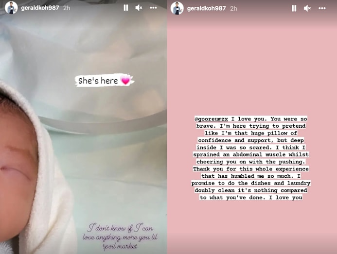 “I think I sprained an abdominal muscle whilst cheering you on with the pushing,” Gerald continued. “Thank you for this whole experience that has humbled me so much. I promise to do the dishes and laundry doubly clean [because] it’s nothing compared to what you’ve done. I love you.”
