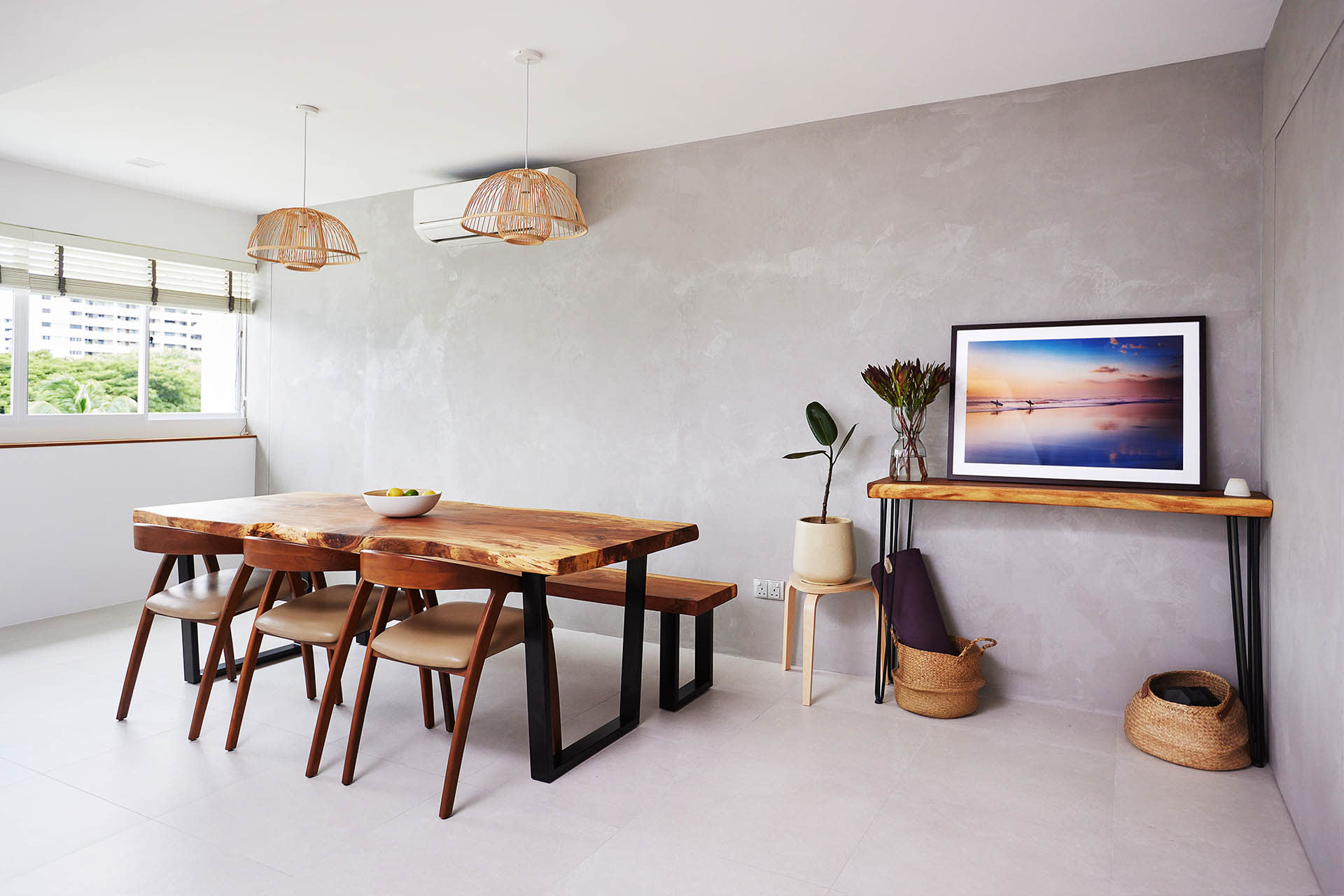 A sap gum wood custom dining table anchors the space, while a suar wood console table with a framed photograph of a beach in Bali taken by a friend complete the look.
