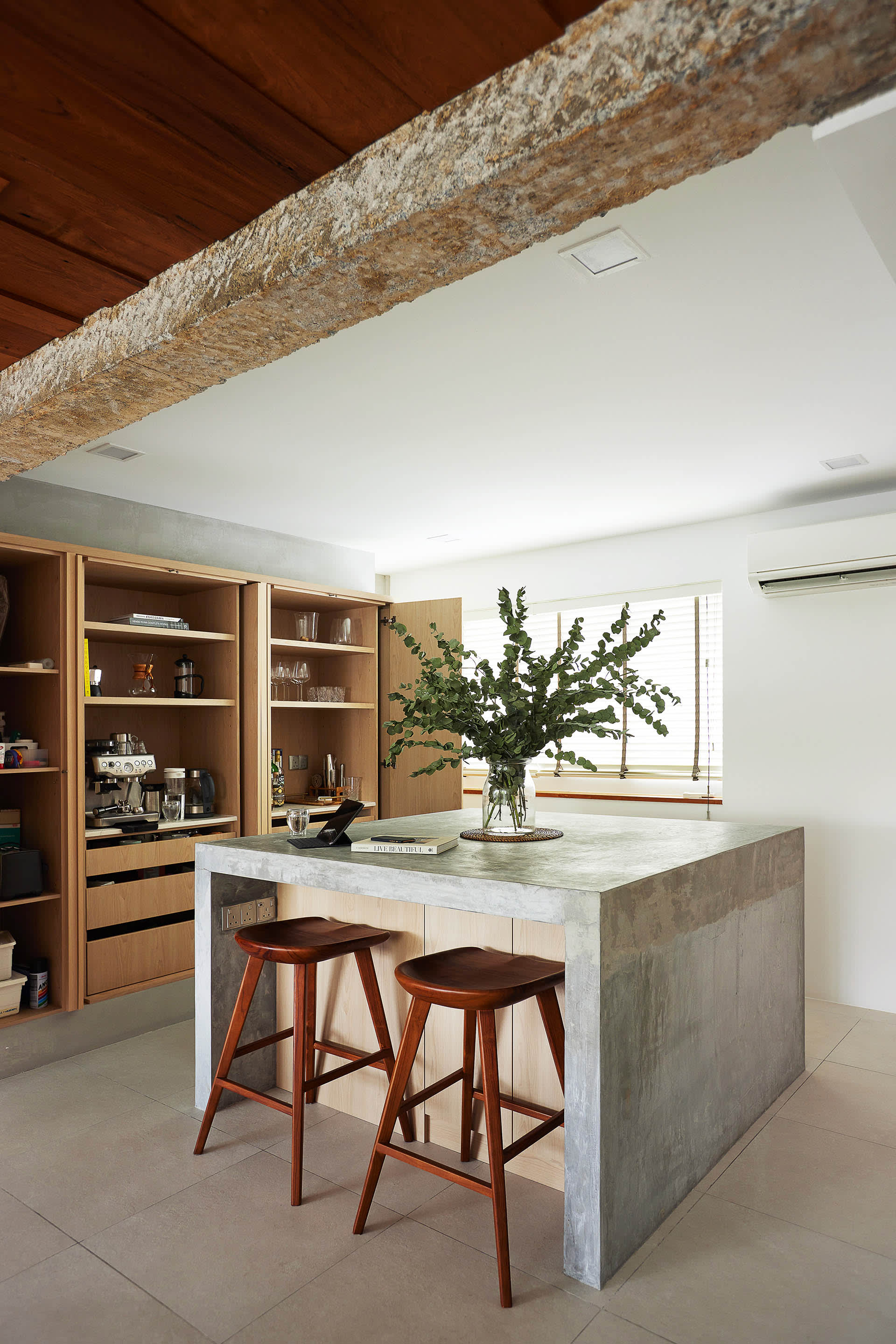 Fun fact: Because it’s made of concrete, the island had to be built on-site. “It was really scary ’cos they hadn’t installed the storage cabinet yet, she explains. So I had to physically measure and decide on the size, but if something went wrong, it’s not like they can shift it around. In fact, after they made it, I realised I didn’t measure if there’d be enough space to move my fridge into the kitchen, but luckily it fit. Just barely.